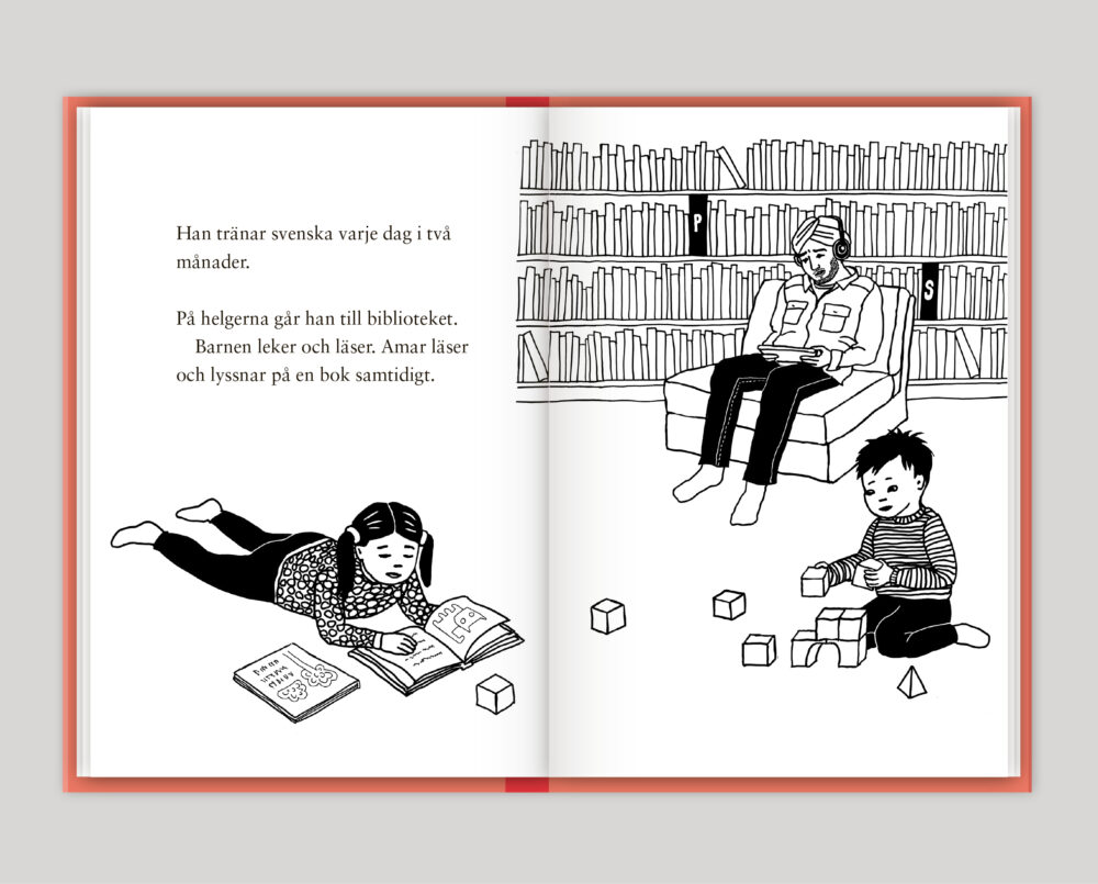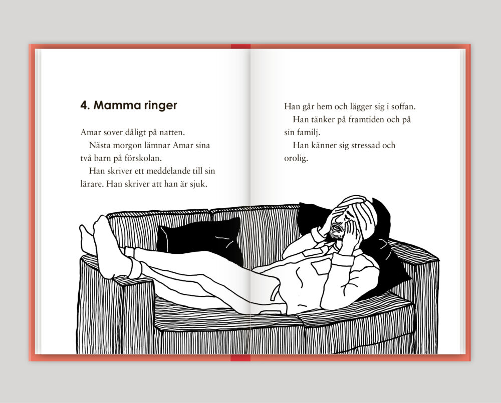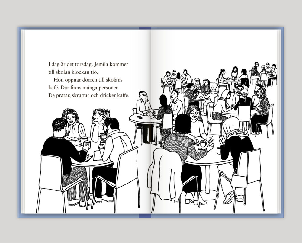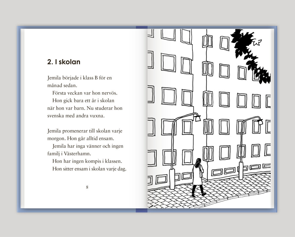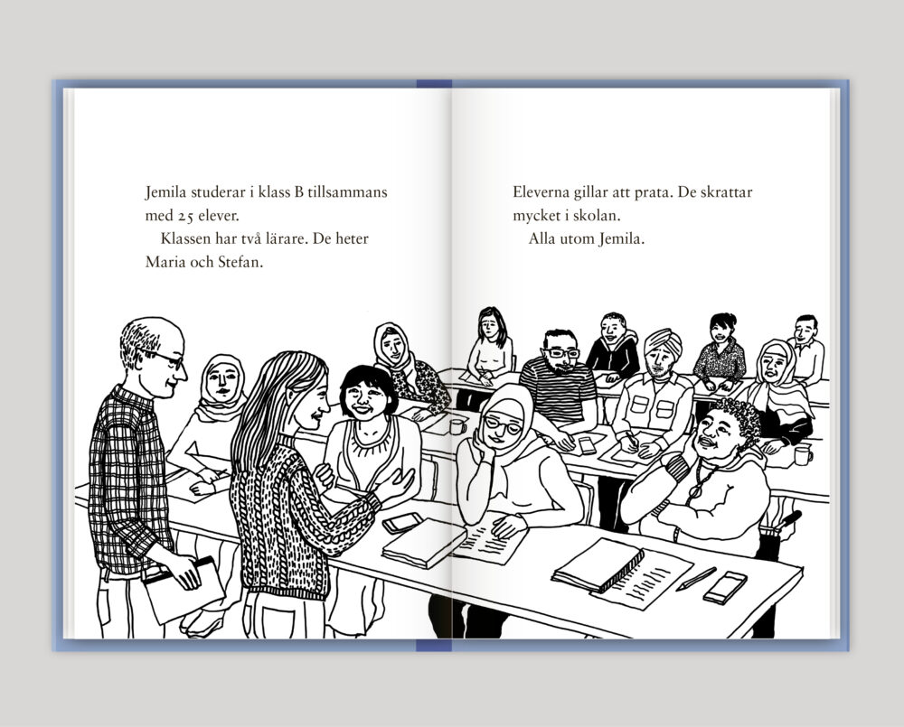 Illustrationer och formgivning av serien Klassen. Lättlästa böcker för vuxna som handlar om elever som studerar i en SFI-klass. Används i undervisning för lästräning, på nivå 2 av 5.