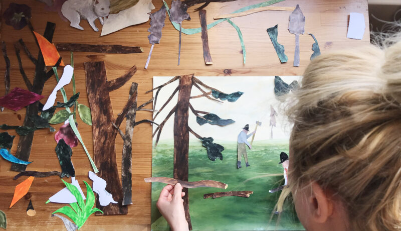 Min lägenhet där jag bor är min hemmaresidens. Det kan vara en utmaning att ha sin arbetsplats hemma, särskilt när man målar, klipper och gör kollage, det finns inte tillräckligt med plats och det blir lätt så att man börjar fokusera på annat. Men det finns fördelar också så klart. Man kan skissa liggandes i sängen eller göra research i soffan med en kopp te i handen. Och så sparar man tid på att slippa åka någonstans, man kan börja jobba direkt när man vaknat och ätit frukost.