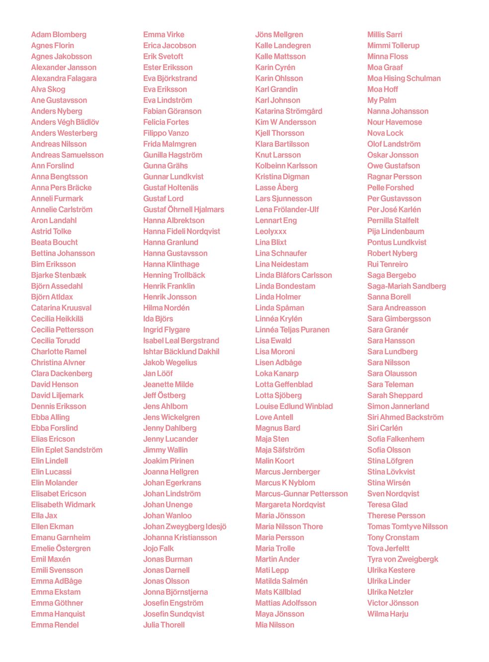 Resultatet är ett unikt dokument över svensk bildkonst idag, med bilder av Joakim Pirinen, Jan Lööf, Eva Lindström, Maria Nilsson Thore, Olof Landström, Gunna Grähs, Stina Wirsén, Owe Gustafson, Lasse Åberg, Sara Lundberg, Eva Eriksson, Ellen Ekman, Sven Nordqvist och många fler.