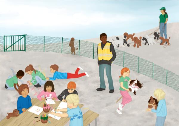 Blyerts illustrationer till kortfilmen Foxters. Föreställande pappan, barnet, räven och björnen.