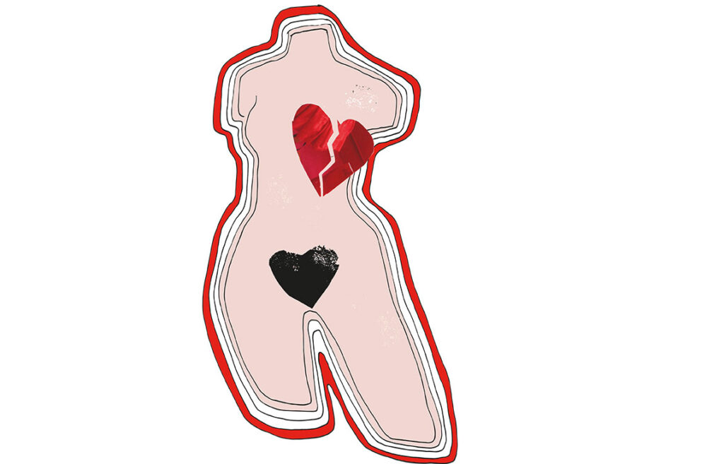 Illustration till skrift på temat ojämlikhet i hälsa och vård åt SKL (SKR). Om kvinnors hjärthälsa som inte får lika omfattande vårdinsatser som mäns.