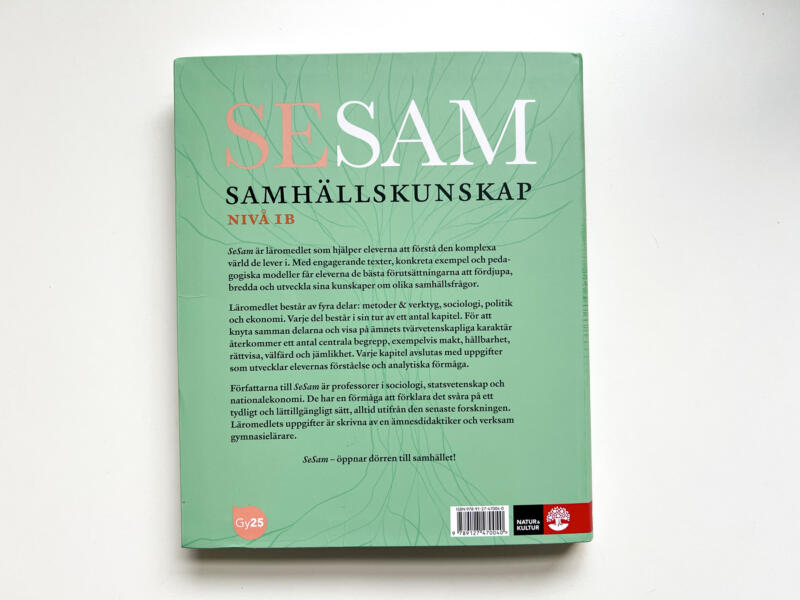 Sesam 1b, Samhällskunskap för gymnasiet åt Natur & Kultur. Utgiven i mars 2026. Baksida.