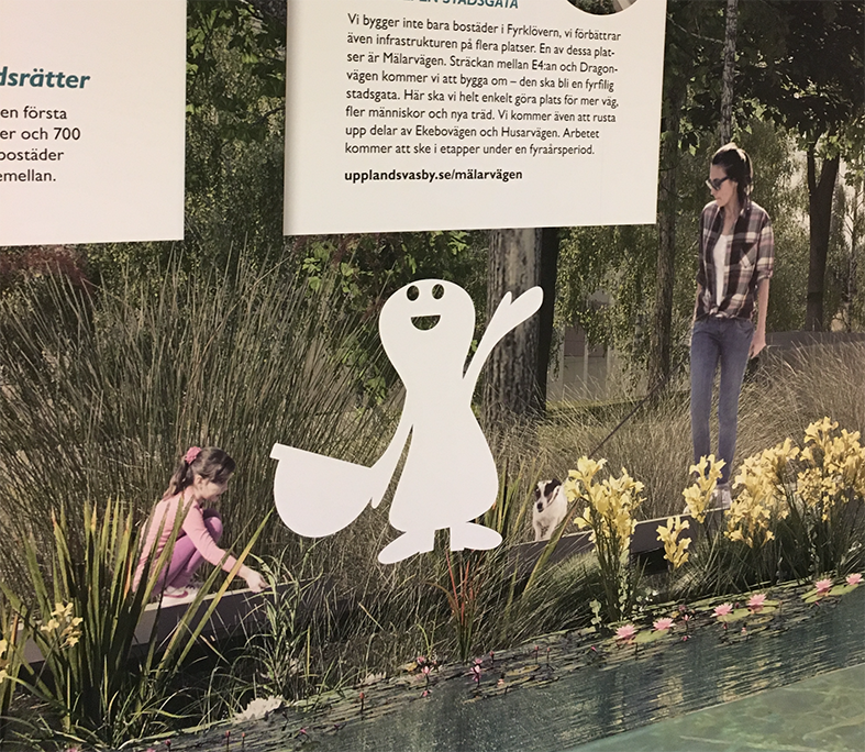 “Väsby bygger om”, ny maskot informerar.