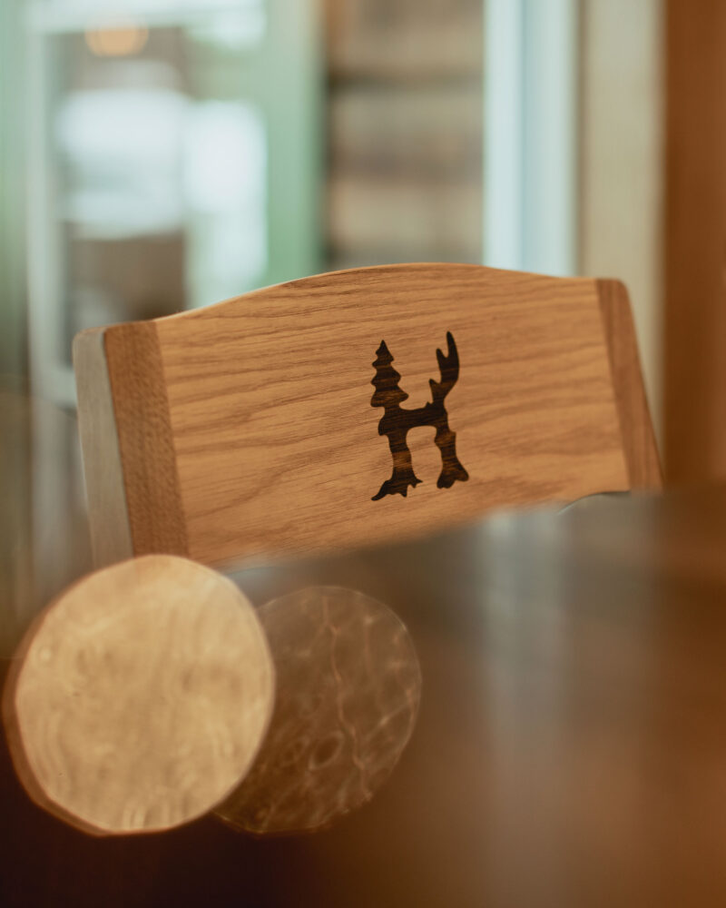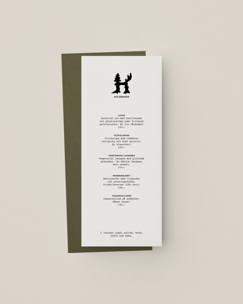 Hvildmarken ligger nära naturen, både matmässigt och som plats. Restaurangen ligger i ett timmerhus, inramat av skogen. Den visuella identiteten har hämtat inspiration från råvarorna och omgivningen. Jag skapade en symbol, som vi kallar Hvilden. Hvilden är en hybrid av flora och fauna och fungerar som en maskot för att representera Hvildmarkens väsen.