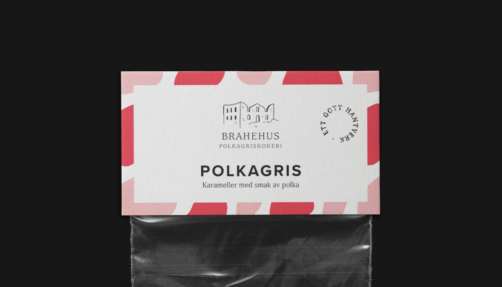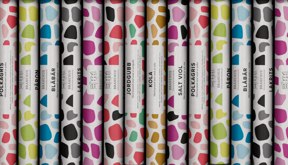 Briefen var att väva in Brahehus ruin för igenkänning och skapa en genuin balans mellan nordisk svalhet och ett gammaldags hantverk. Jag valde att inspireras av ruinens stenfasad för att skapa ett mönster som även kan appliceras på förpackningsdesign där vi smakkodar produkterna med olika färgkombinationer.