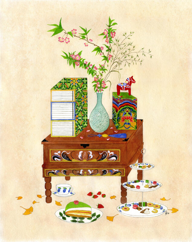 Koreanska färger på akvarellpapper inspirerad av koreansk genremåleri ”chaekgeori”. En målning om mellanförskap. 2022.