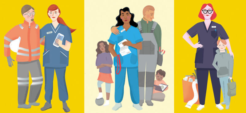 Illustrera tre vårdbiträden med familjer. Kommunalarbetaren har jämfört deras ekonomi 2019/2024.