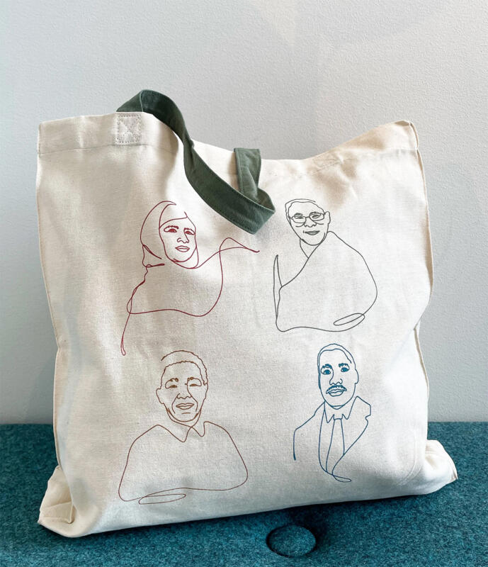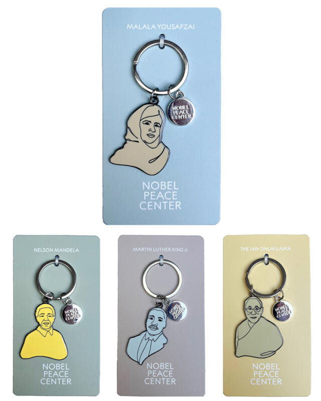 Porträtt av fyra fredsprisvinnare för Nobels Fredscenter; Nelson Mandela, Martin Luther King Jr, Malala Yousafzai och Dalai Lama. Porträtten finns som pins, T-shirts, nyckelringar och totebag i museibutiken på Nobels Fredscenter i Norge. 🕊️