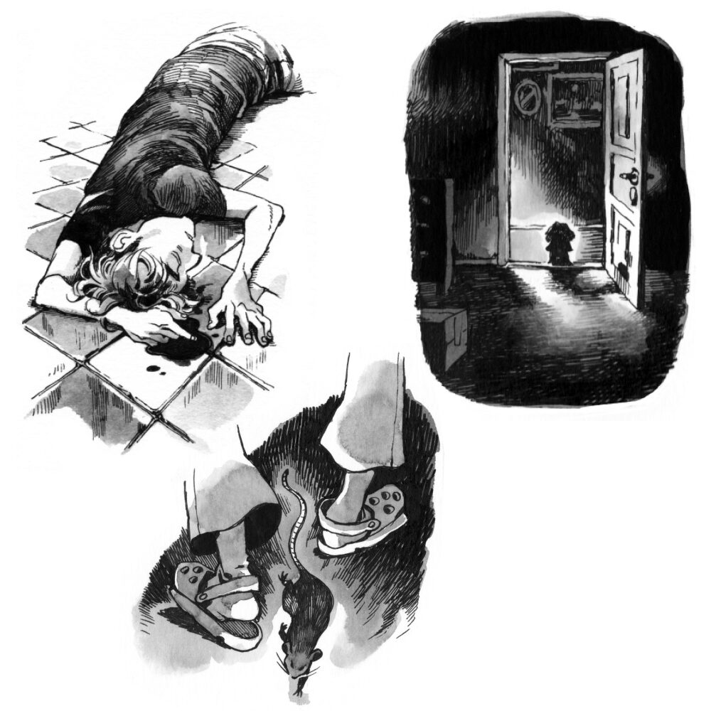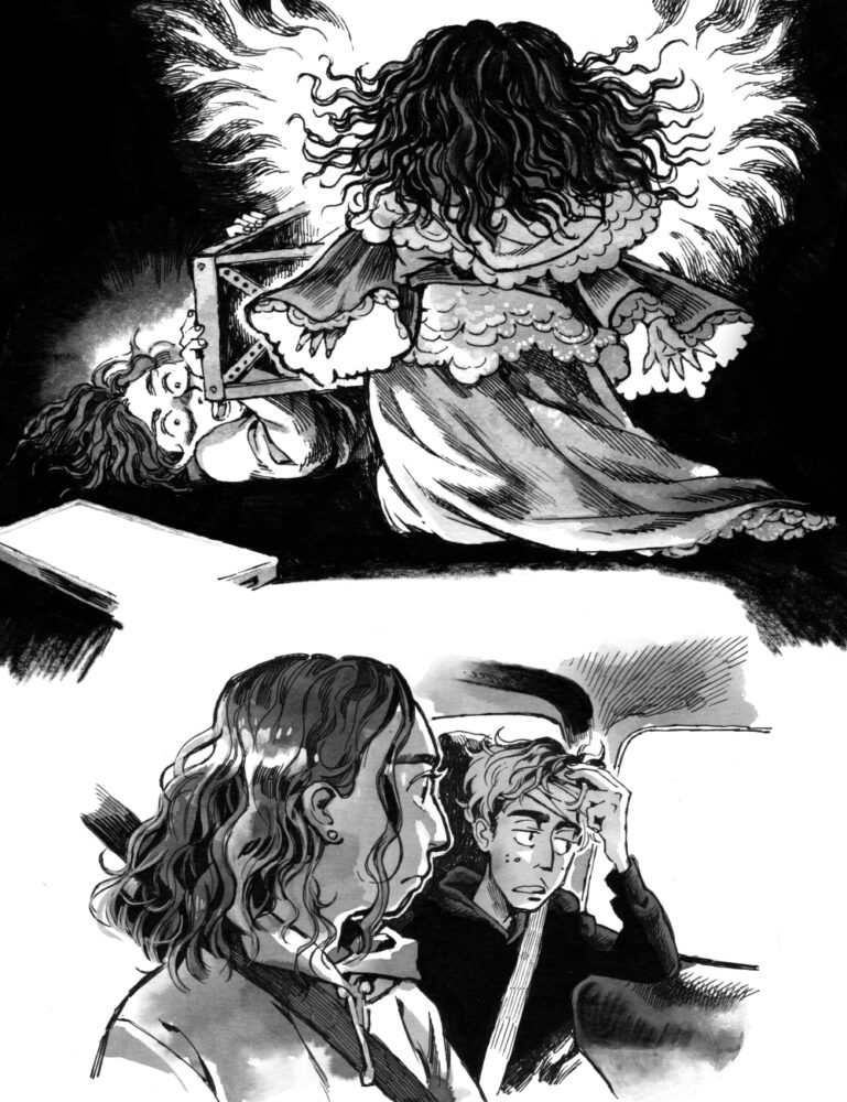 Svartivita illustrationer i tusch och akvarell till inlagan av en lättläst skräckbok för barn, Skattgömmans Förbannelse 1: Dockan av Donna Shelton. Ges ut av Hegas Förlag i december 2022.
