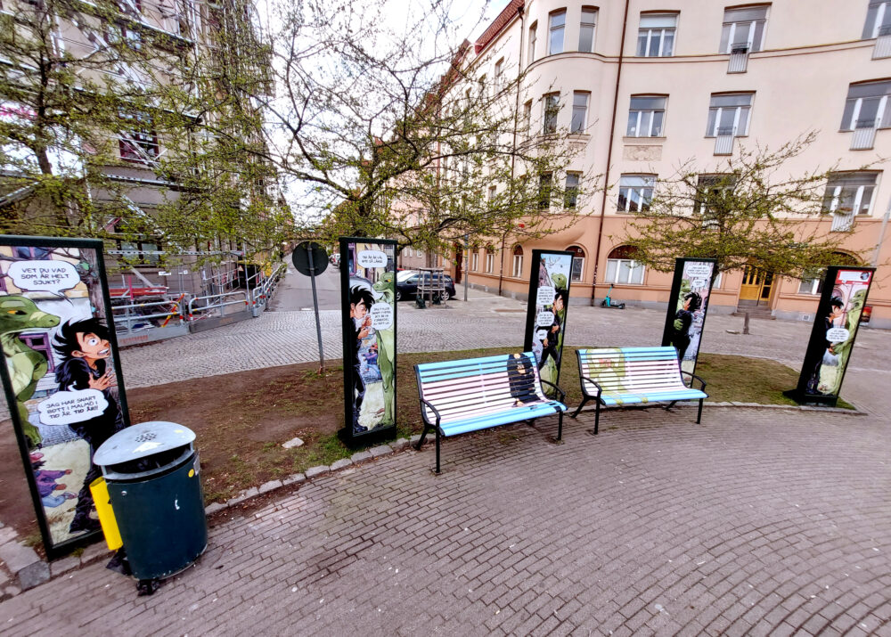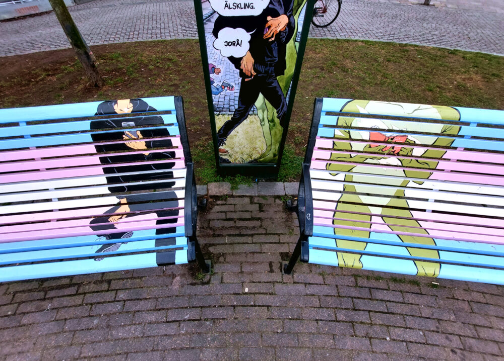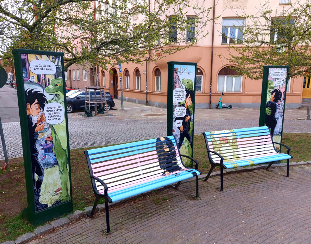Konstinstallation med bänkmålning och seriekonst på pelare, Serieområdet (Seriestaden Malmö)