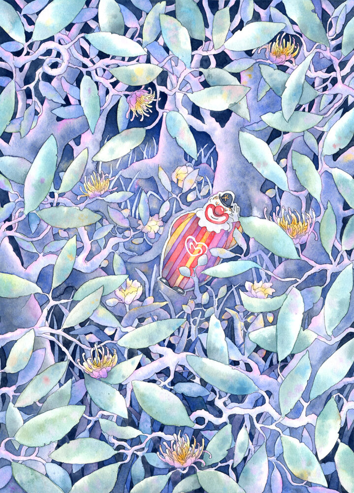”Is GB-gubben burnt out or just sleepy?” A school project about appropriation. In this project I explored themes like stress and advertismenet and wanted to give GB-gubben a well-deserved rest. The result was an animation and this painting. Watercolor on cotton paper.
