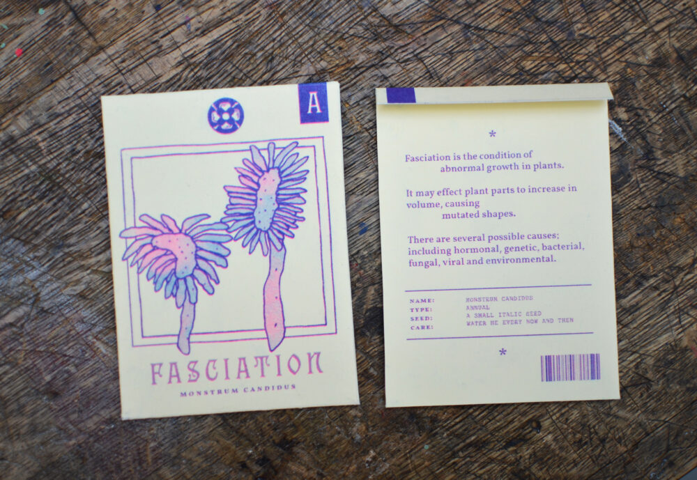 Fanzine inspirerat av fröpåsar tryckt med risograf.