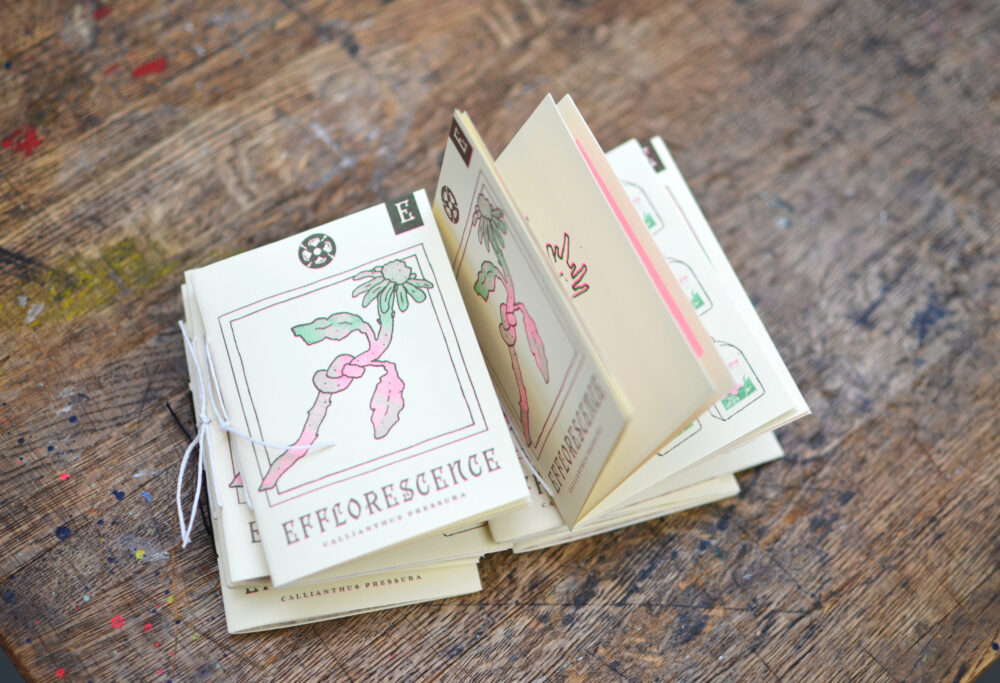 Designen på publikationerna inspirerades av fröpåsar, men med en text som beskrev olika botaniska fenomen. Texten var faktabaserad men eftersom projektet handlade om inre världar satte jag texten som en dikt.