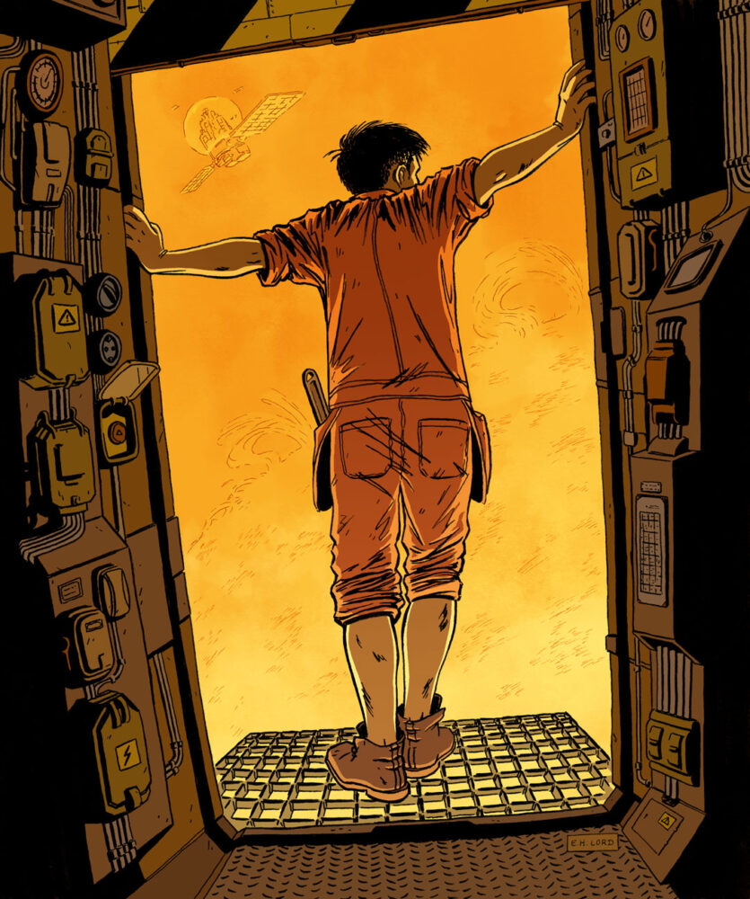 En mekaniker tittar ut över en brinnande stjärna. Kring dörröppningen bakom honom sitter sladdar, strömbrytare och elskåp.