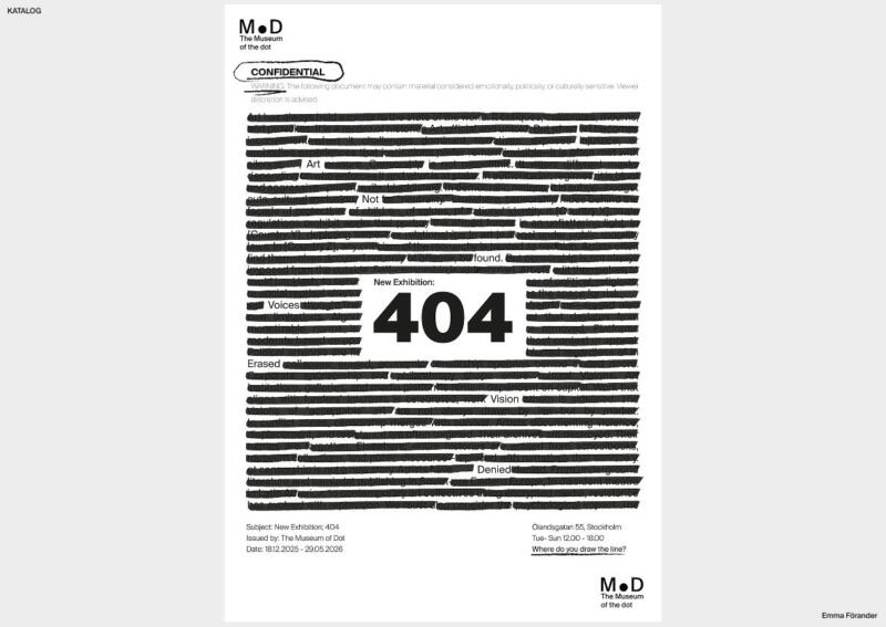 MOD är ett fiktivt museum som utforskar vår digitala samtid genom en filosofisk lins. Den första utställningen, “404”, behandlar yttrandefrihet i den digitala tidsåldern – med teman som cancel culture, självcensur, trolling och algoritmisk makt.