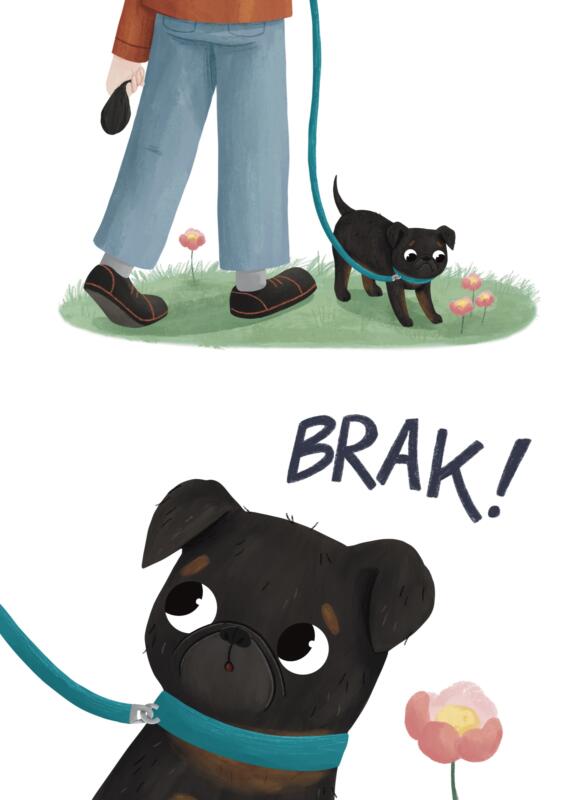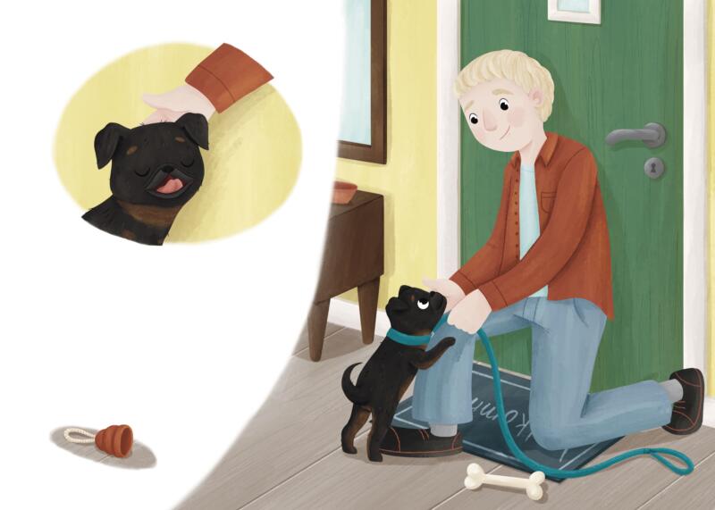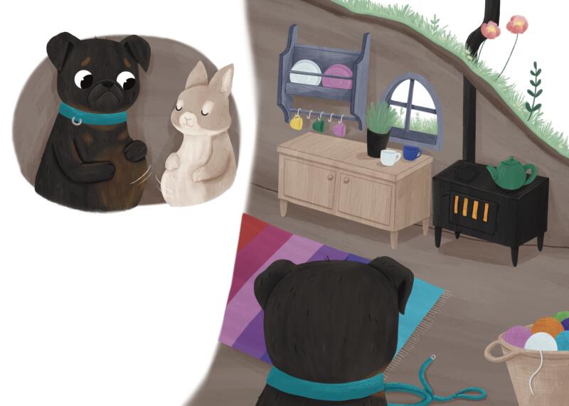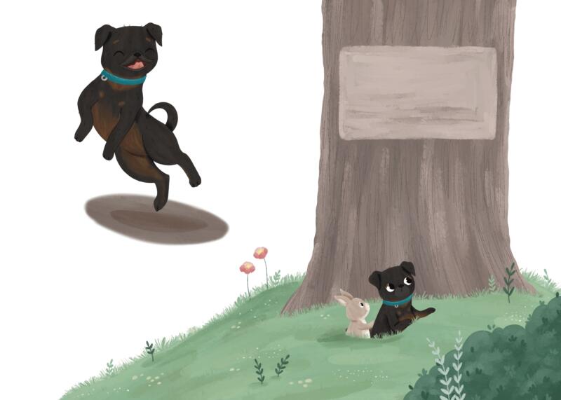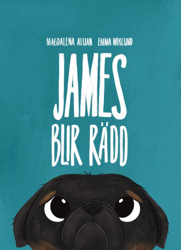 Illustrationer och omslag till barnboken James blir rädd, en bok om en liten hund som blir skrämd och får hjälp med olika övningar som man kan göra när man blir rädd och känner dig orolig.