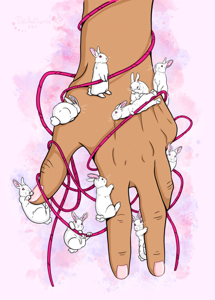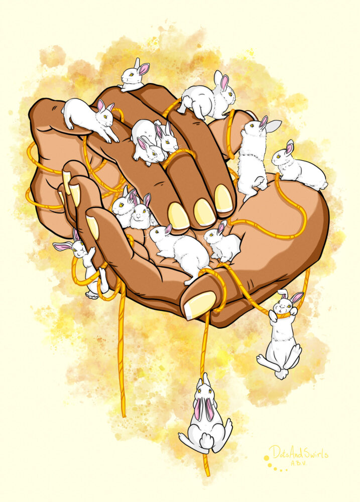 Personal illustrations of hands with tiny, tiny climbing bunnnies. Sold as prints at conventions.