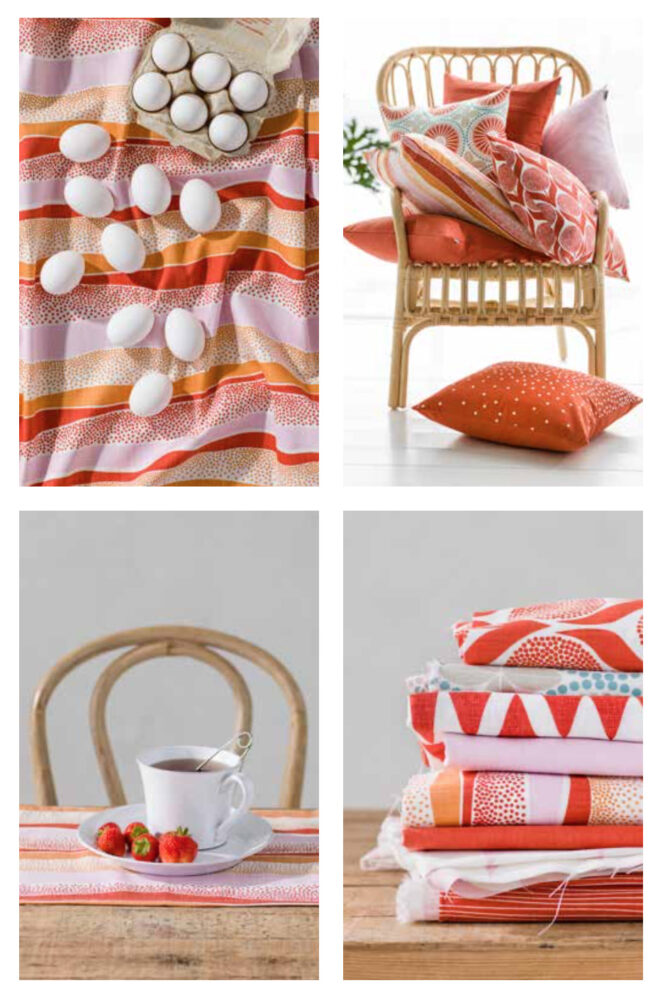 Pattern for textile for Spira Inredning. A pattern consisting of organic stripes formed by fields of color and playful dots.