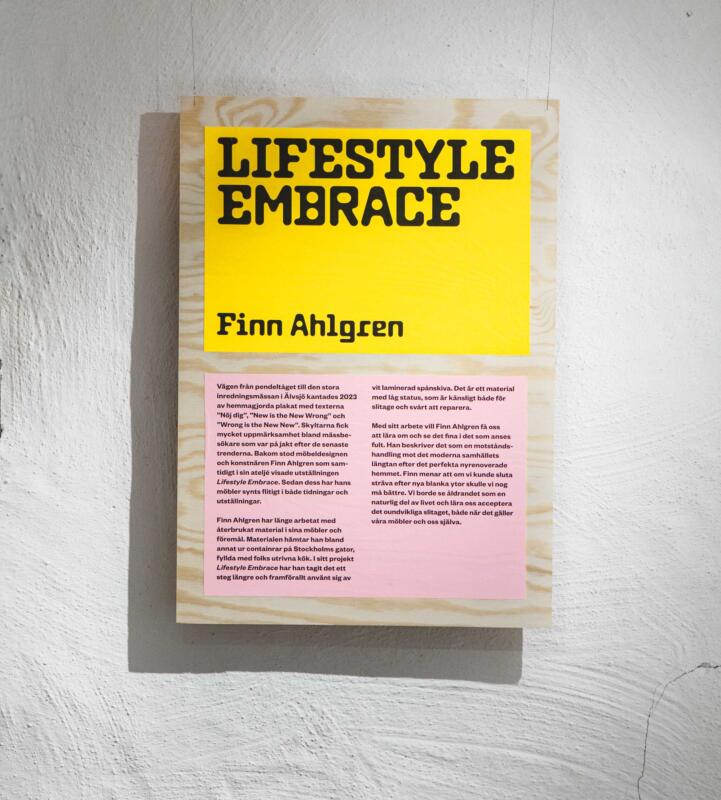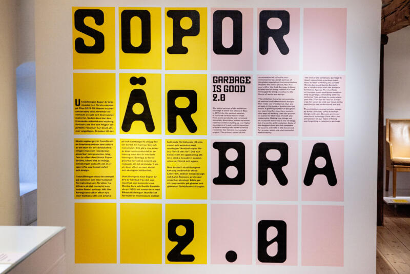 Visual identity, signage and catalogue for an exhibition about design and recycling. To save on materials, all signage was printed on colored office paper that was wallpapered onto walls and recycled plywood sheets.