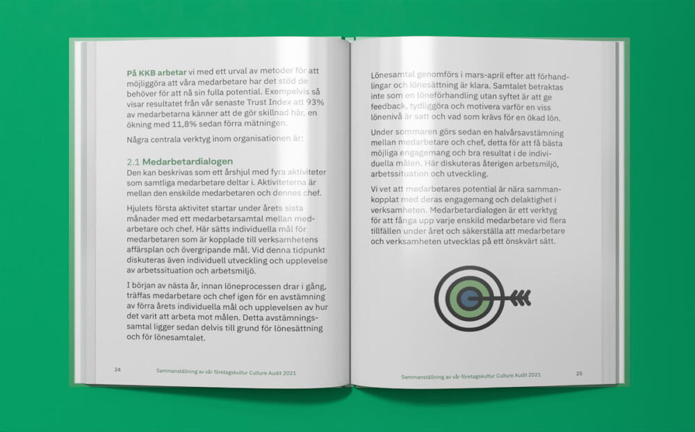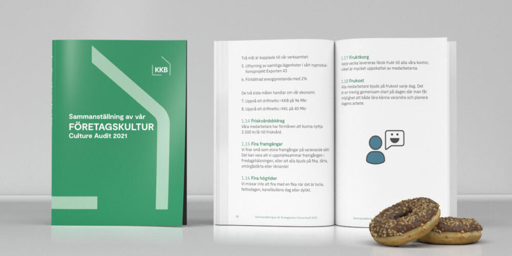 Graphic design for a booklet on company culture by the Swedish real estate company KKB, set in their graphic profile.