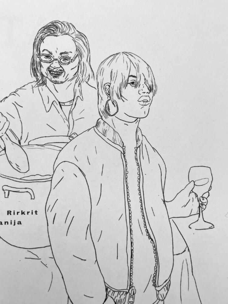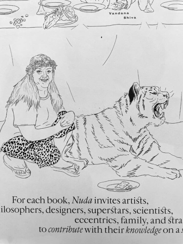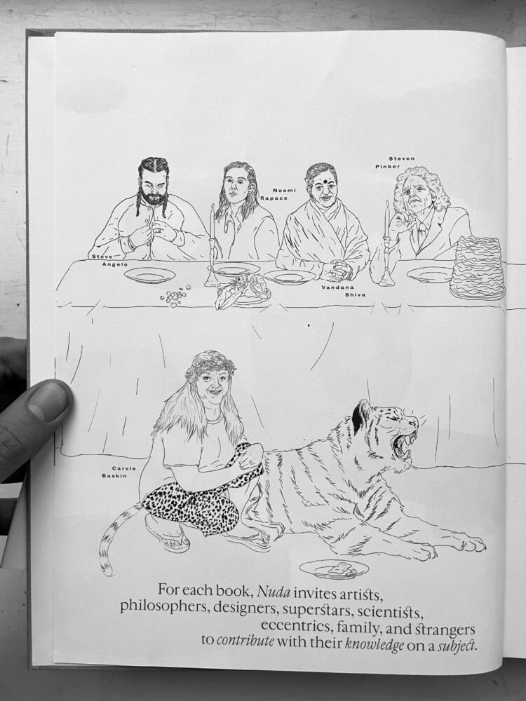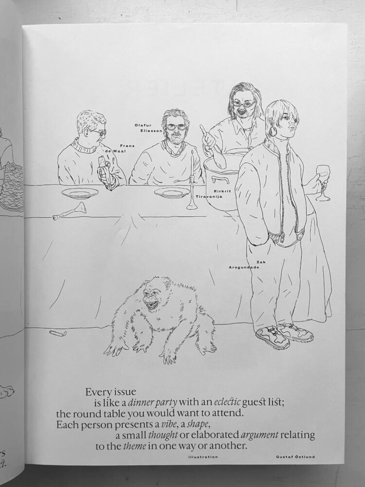 An illustration for a spread in the publication Nuda – Terra, 2020. The illustration presents the people interviewed in the publication with portraits of them around a dinner table.