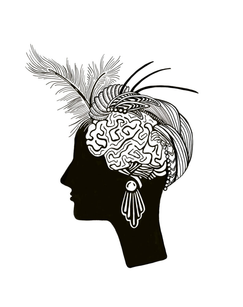 This image should describe the theme of the book - to become a social genius (and at the same time stick to the mingling and 20th century themes). I chose to make a silhouette with festive 20th century accessories, and at the same time show how the brain is working to become a social genius.