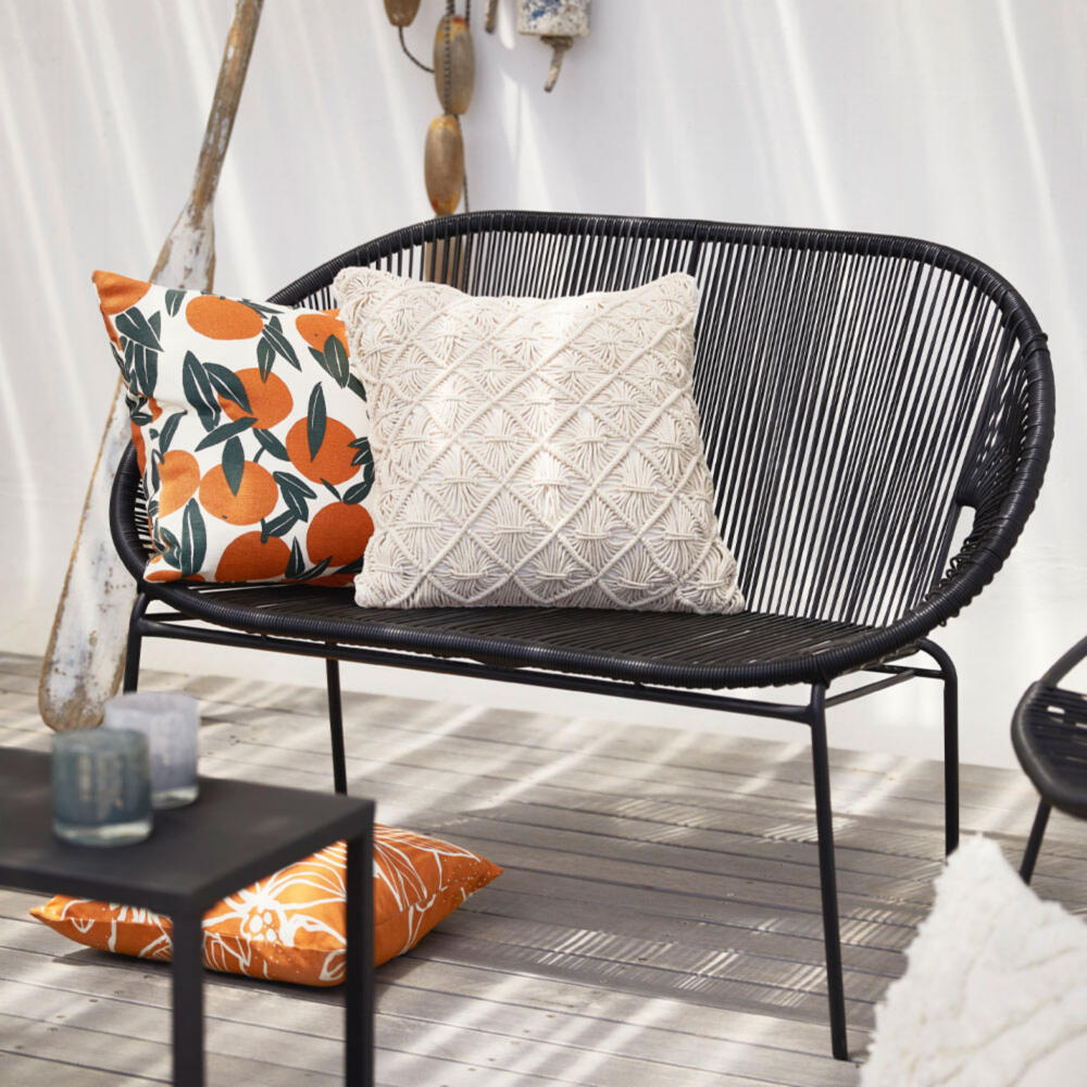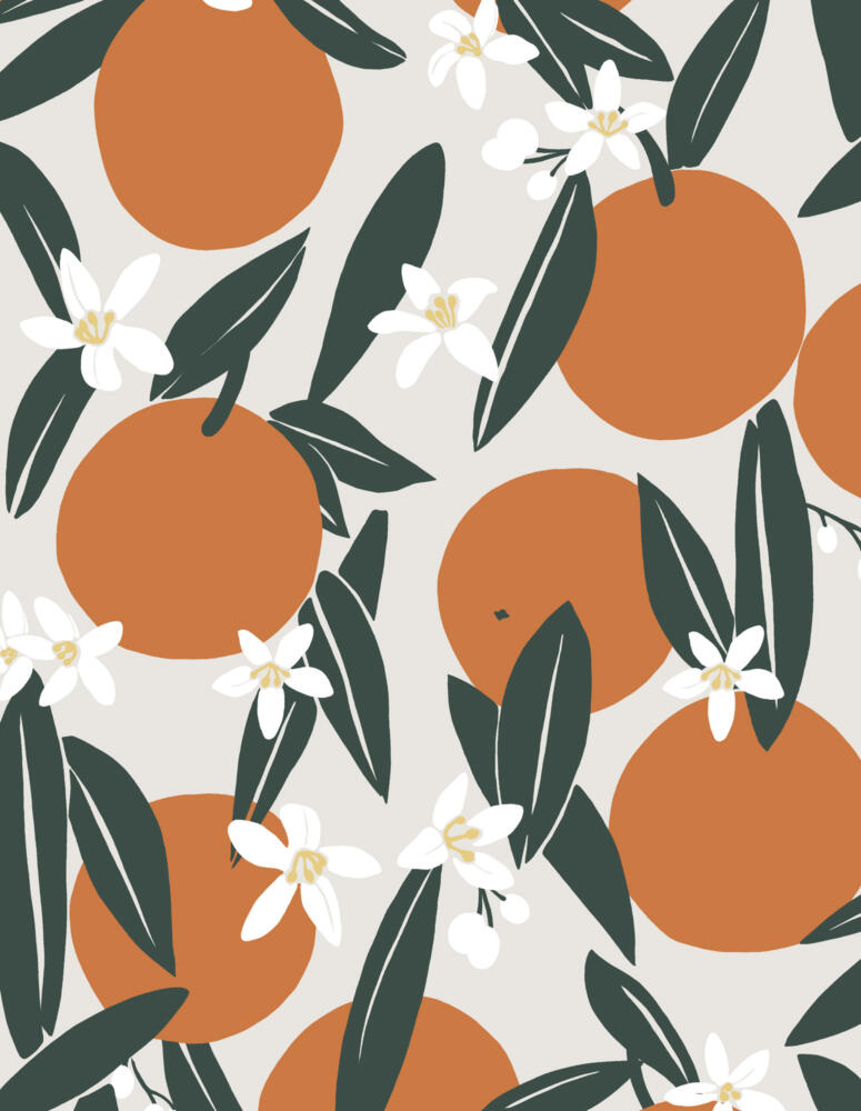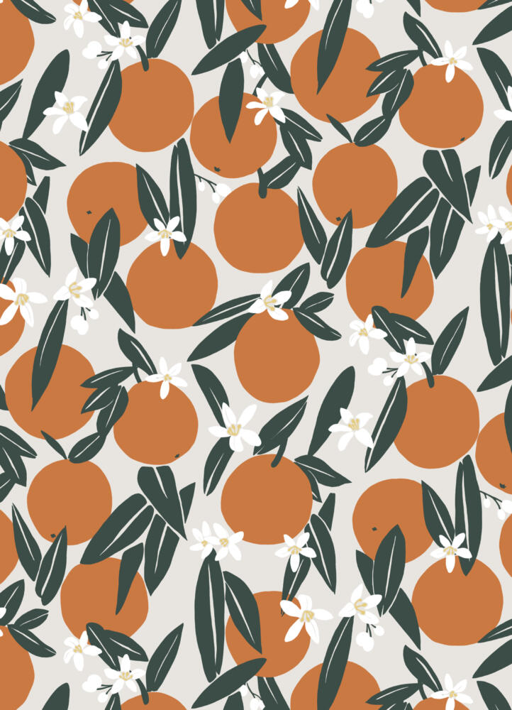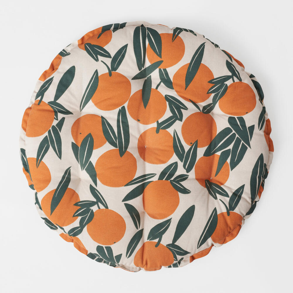 Citrus print with a summery feel inspired by Italian fruit tree gardens. Flat orange shapes and abstract leaves sprinkled with buds and flowers. For outdoor living collection at Åhléns Home with products including seat cushions, blanket and cool bag.