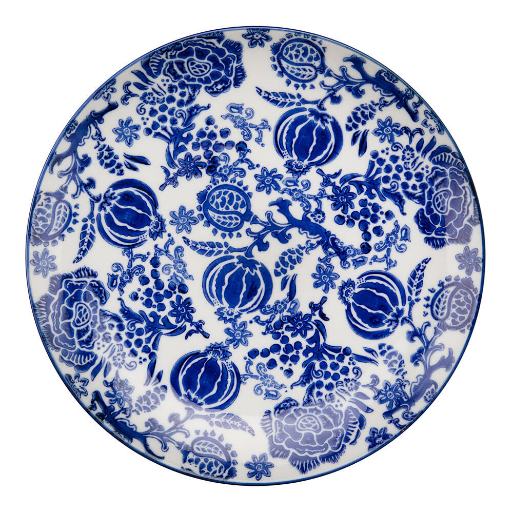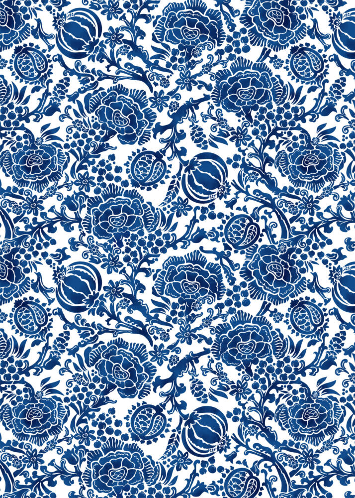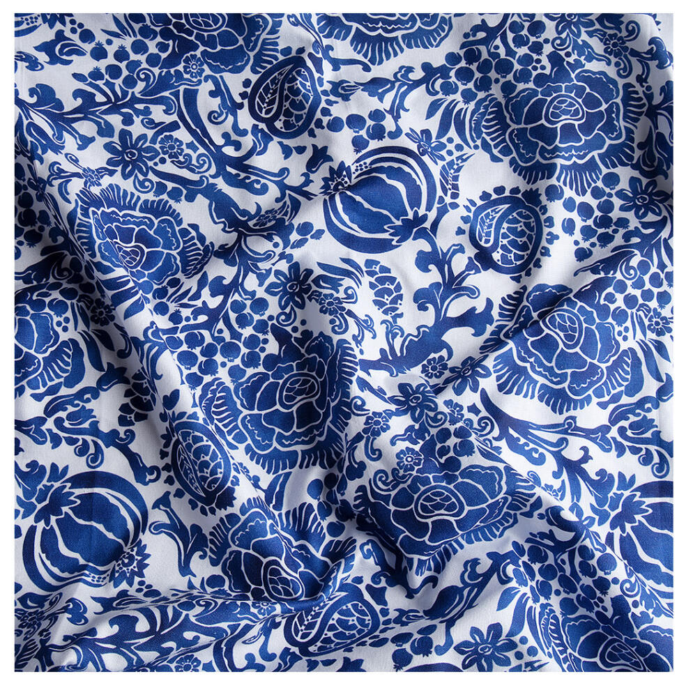 Organically flowing floral print for in watercolor-like blue tones for spring collection at Cervera. Products including table cloth, apron, serving dish and mug. Inspired by classical blue and white china, with a fresh summer feel suitable for setting the table outside in the garden.