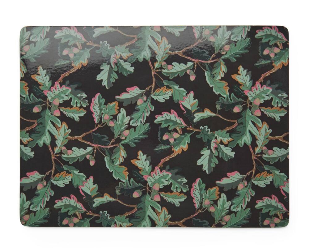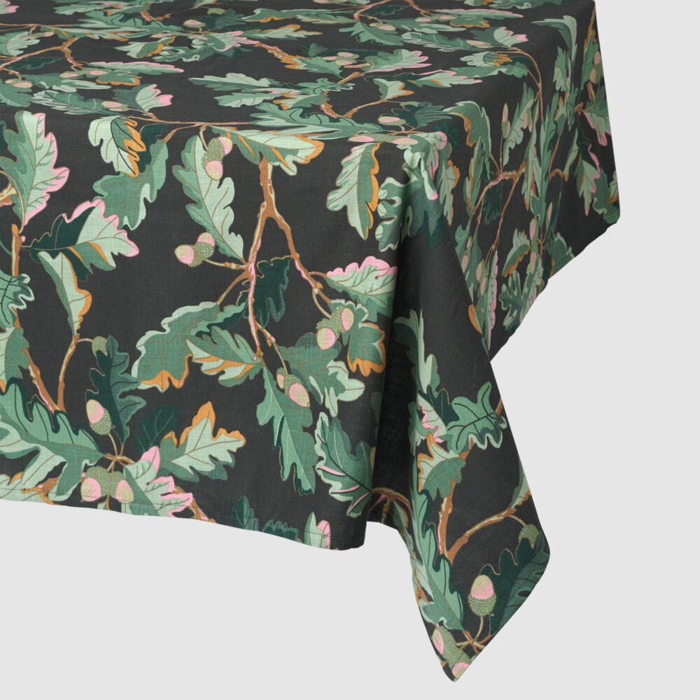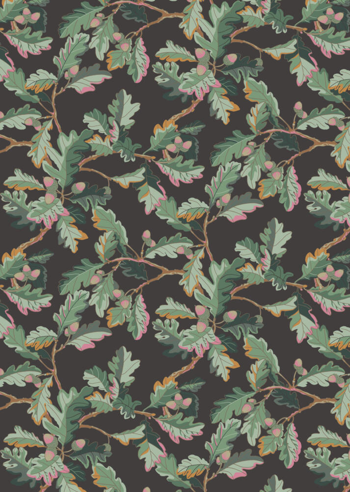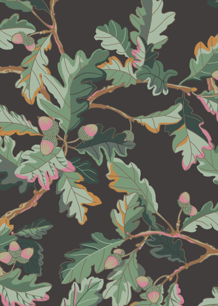Organically flowing leaf print with acorns for autumn collection at Åhléns Home. Dark ground with winding branches, rich in detail with pops of colour in hot pink and mustard yellow.
