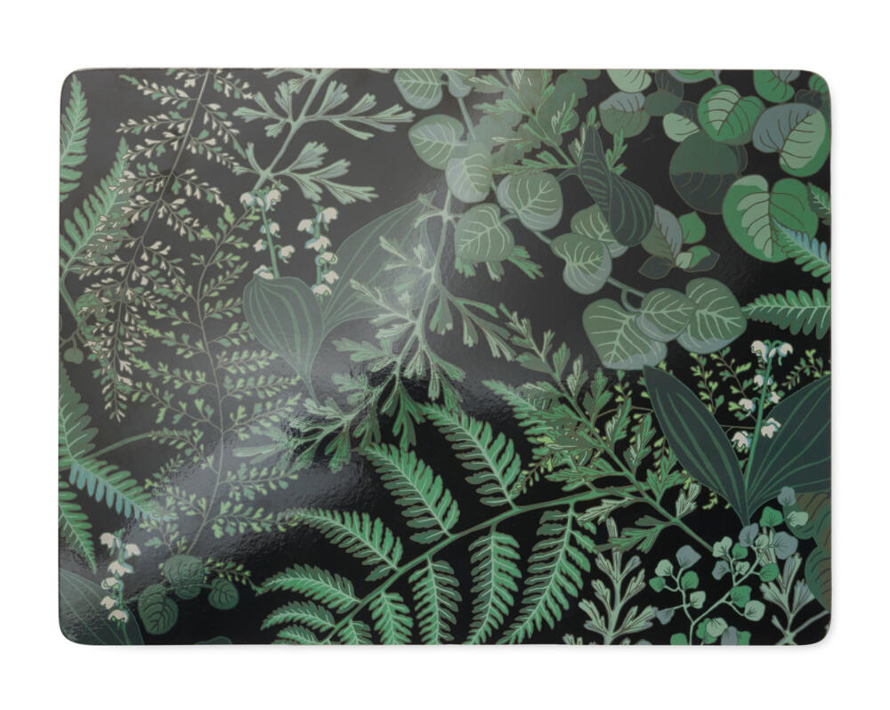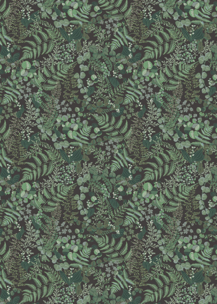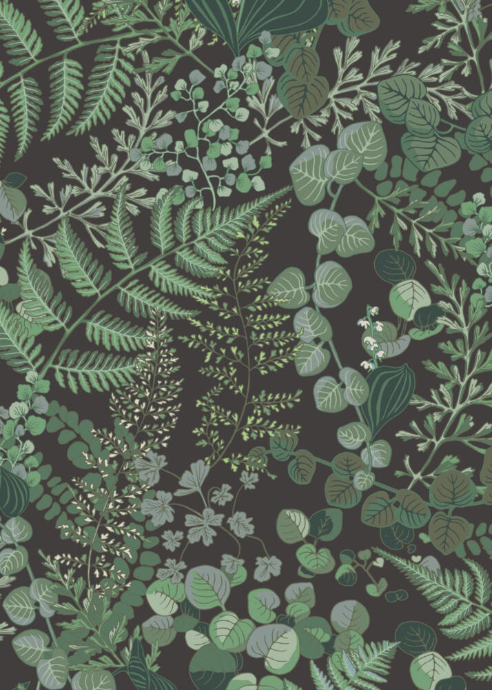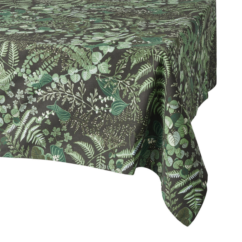 Handdrawn leaf print for spring collection at Åhléns Home with products including table cloth, place mats and napkins. Dark earthy ground with spiring leaves in a variety of species and green tones.