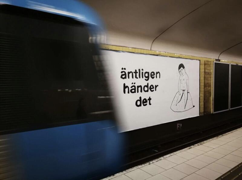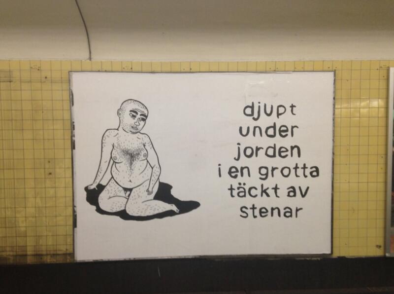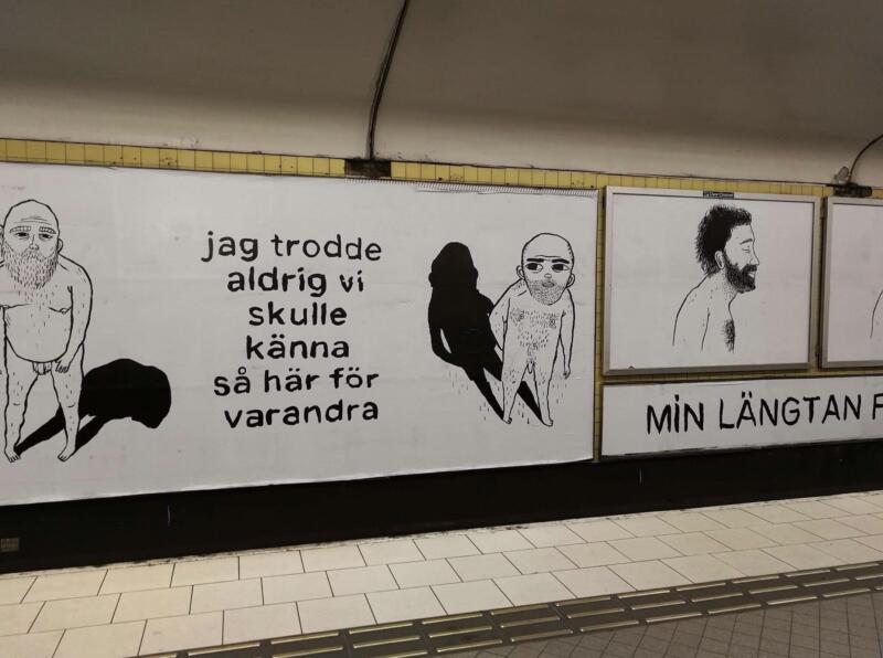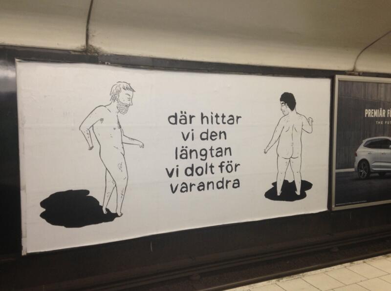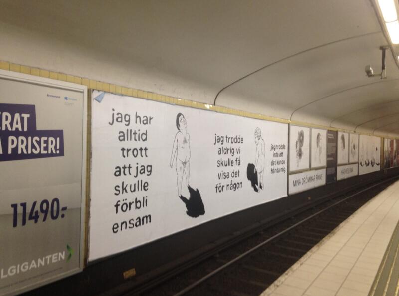 Temporary public artwork as a part of SL’s project ”konstväxlingar”, exhibiting art in the subway. A comic readable anywhere on the platform, and a safe inner world, in a moving space.