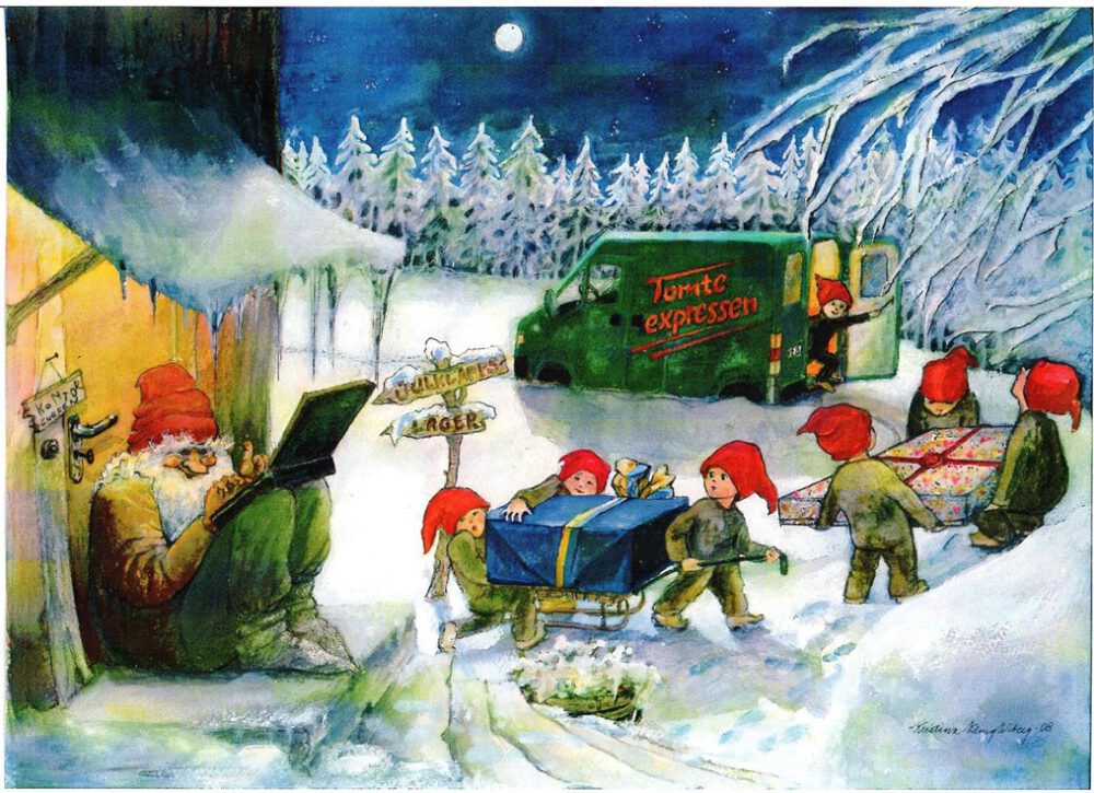 A client in the transport business commissioned me for a Christmas card motif in classical style, reminiscent of Elsa Beskow.