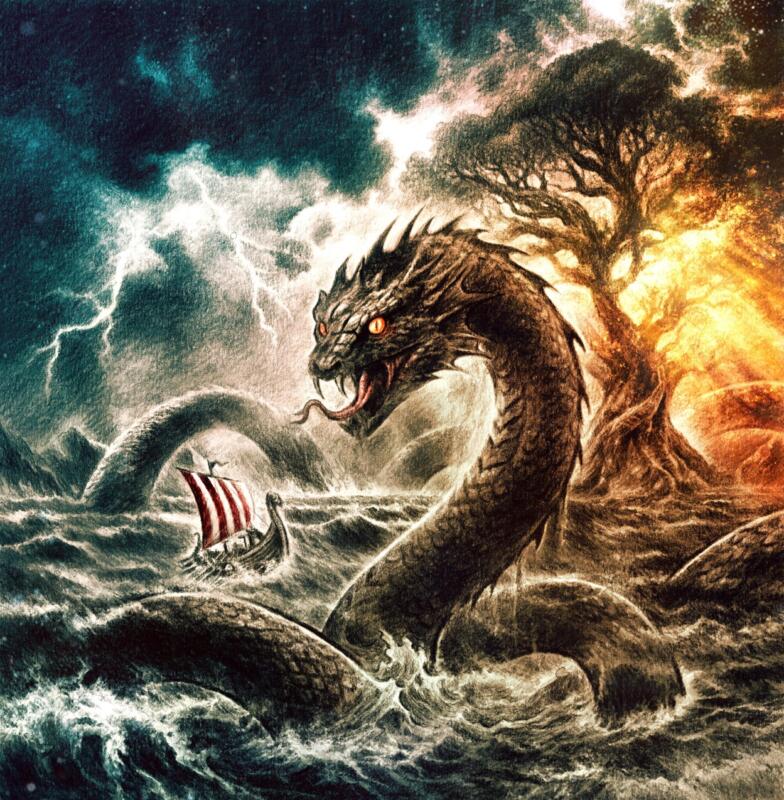 The tales of the asa gods' eternal struggle against chaos and giants, of revenge, love and dark forces that constantly threaten to destroy the world. Sea serpent and a viking ship.