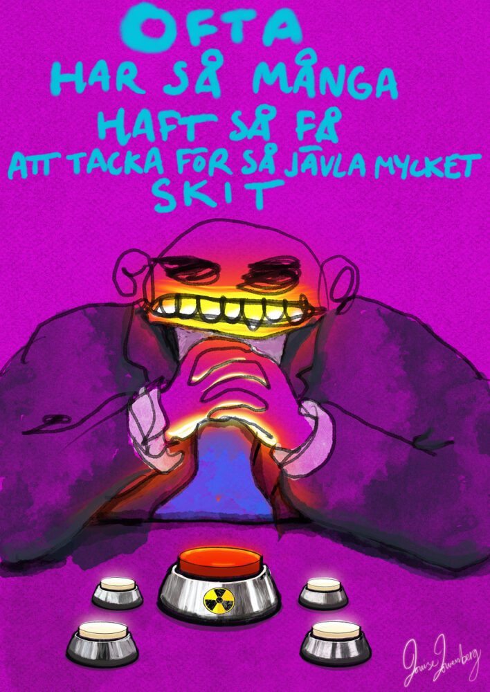 Contribution to Tecknaruppropet Moment 2022, an initiative where more than 130 illustrators took a stance against Nato and nuclear weapons, by making satire. All contributions have been collected in a book.