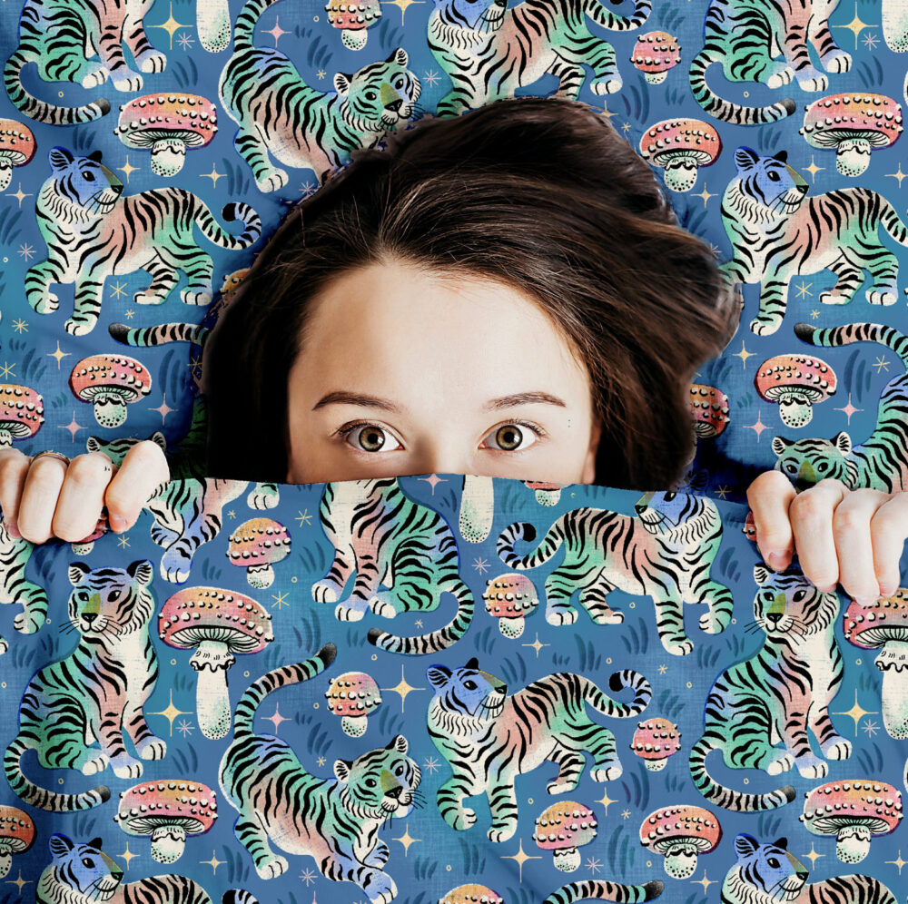 Pattern imagined for children featuring tigers, toadstools and stars,
