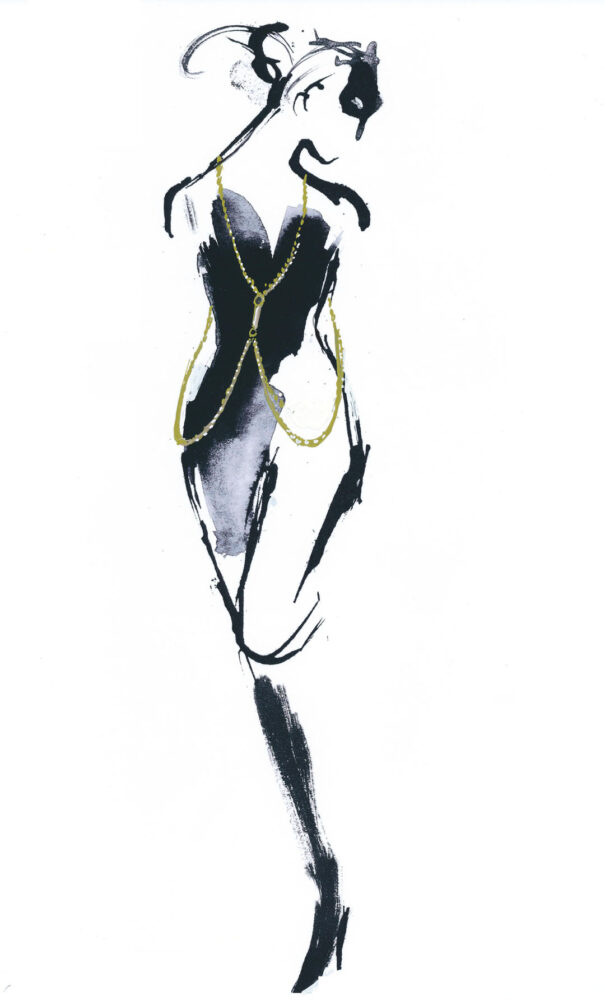 Modeteckning för Cornelia Webb/Ellos. Tusch, smycken,svart/vitt.