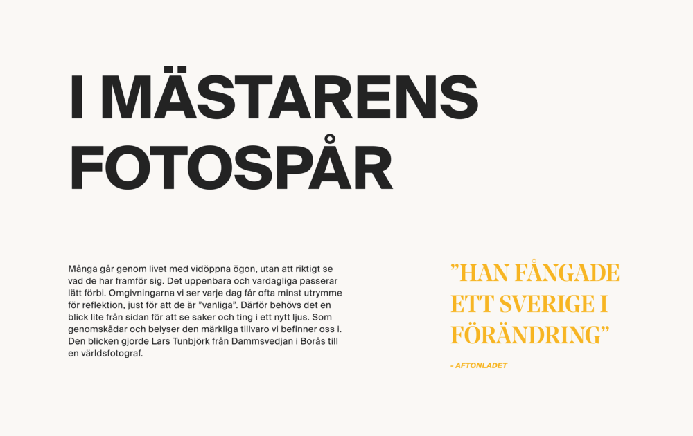 I created a visual identity that would reflect Tunbjörks straight forward and eye-catching style, yet let his photographs take the center of attention on the new website.