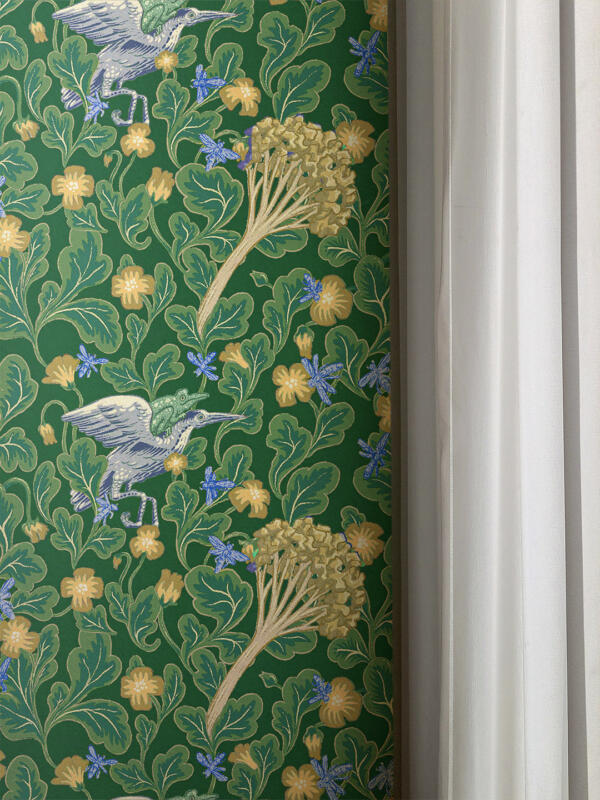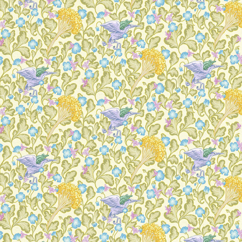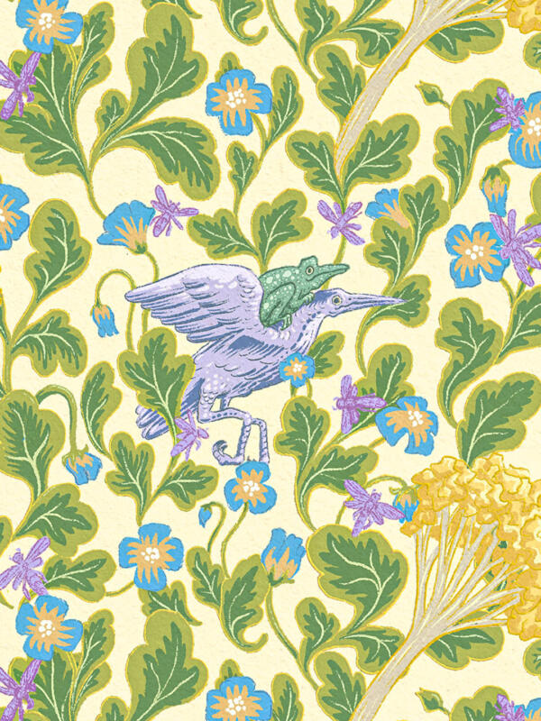 A lush pattern depicting two animals journeying through a flowery landscape.