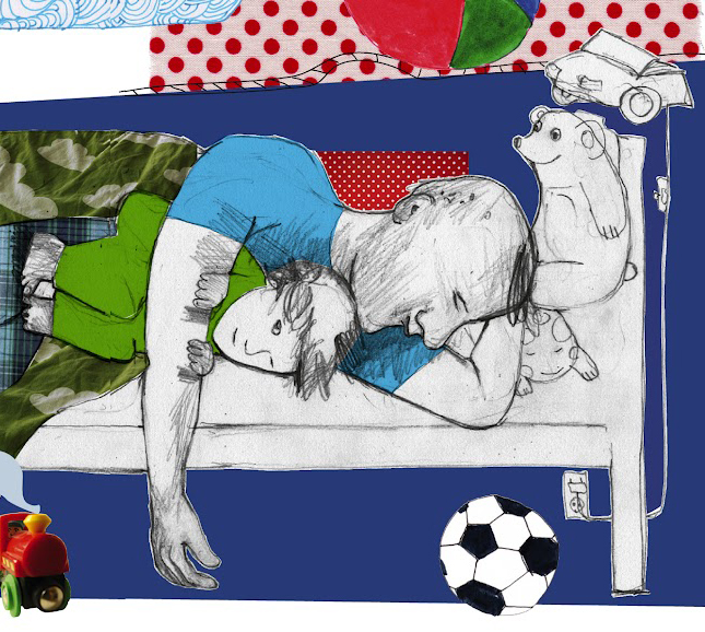 Detalj av Eva edbergs illustration ur barnboken När jag lånar ut pappa till landet Osams, författare Torbjörn Engelkes.