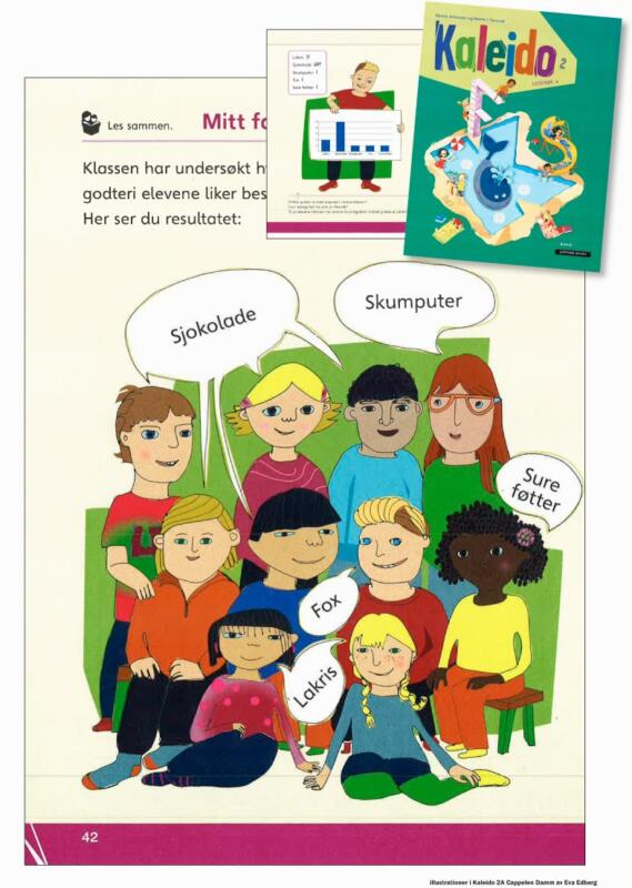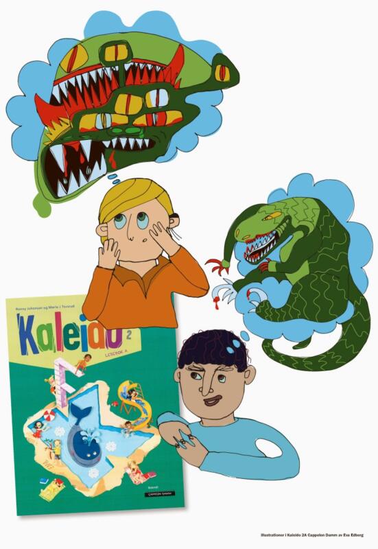 Illustrationer av Eva Edberg till Kaleido, norska skolböcker för 7-8 åringar. Utgivet av förlaget Cappelen Damm. Ett urval av 30 bilder, som visar en skolklass där eleverna finns med i olika lärmiljöer.