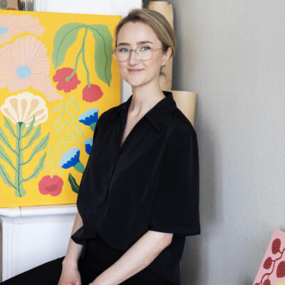 En bild på mig, Fia-Maria, som målat fönstret. I min vänstra hand håller jag en penna.