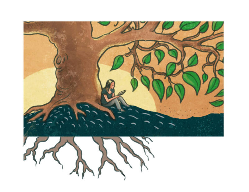 Inzoomad detalj av flicka som sitter under trädet och läser.