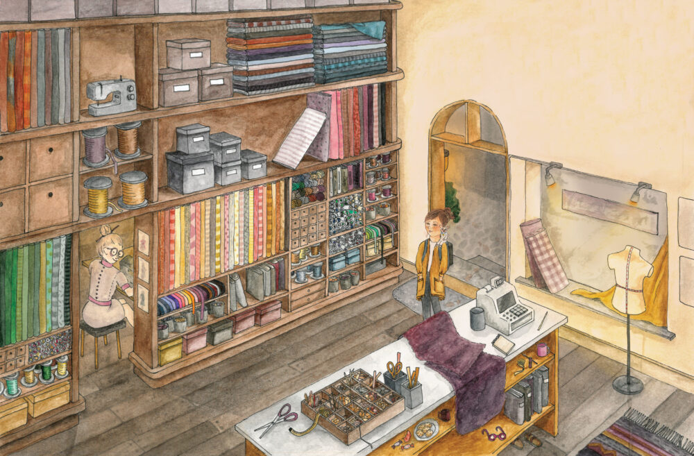 "När de kliver in genom den öppna dörren till tygbutiken plingar det till längre in i affären. De hör en stol som skjuts ut och någon som harklar sig. Det är tyger överallt, stora bord och massor med knappar i olika färger och former." Citat ur boken Jakten på den försvunna mamman, skriven av Anna Nilson. Författaren ville ha bilder med mycket detaljer, man ska kunna upptäcka något nytt varje gång man ser bilden. Jag tycker då att det är roligt att lägga till lite finurliga detaljer som att försäljerskan har ett hemligt kak- och godisförråd bakom försäljningsdisken.