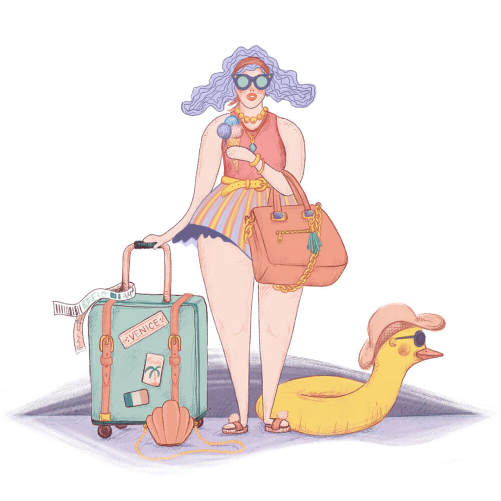Illustration till en text med rubriken "Jag älskar att resa!" Jag ville visa en person som är förberedd på sin resa från topp till tå och som sätter likhetstecken mellan att resa och att flyga.