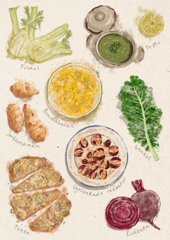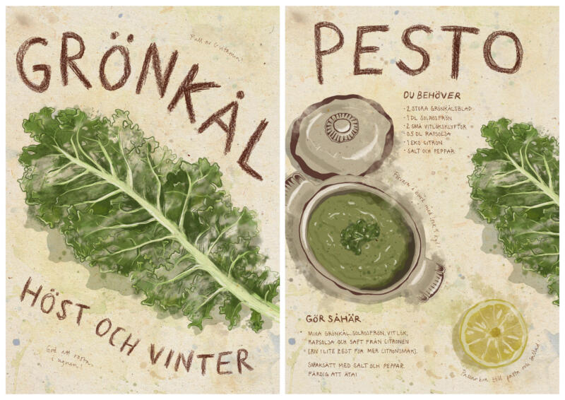 Skapade en serie på nio informativa inredningsaffischer om säsongsbaserad matlagning. Den första affischen fungerar som samlingsaffisch, följt av fyra par där varje grönsak illustreras med skördesäsong och kompletteras av en receptaffisch. Arbetet kombinerar digital illustration med handgjorda tekniker till ett enhetligt uttryck.