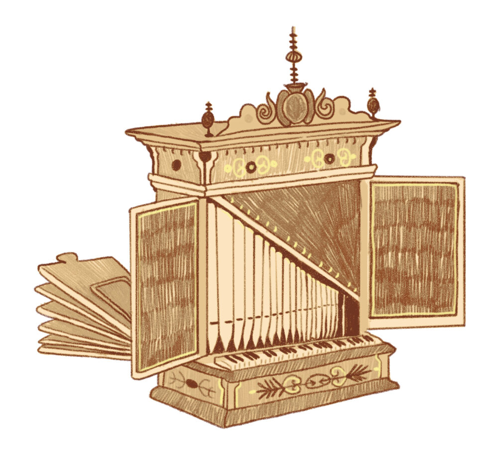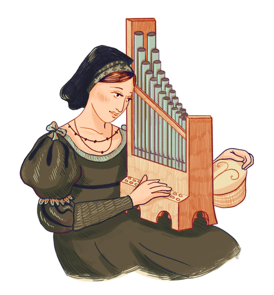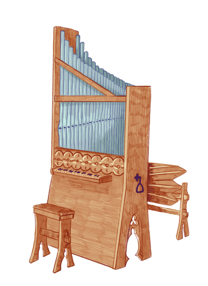A portative organ with a musician to show the scale of the instrument