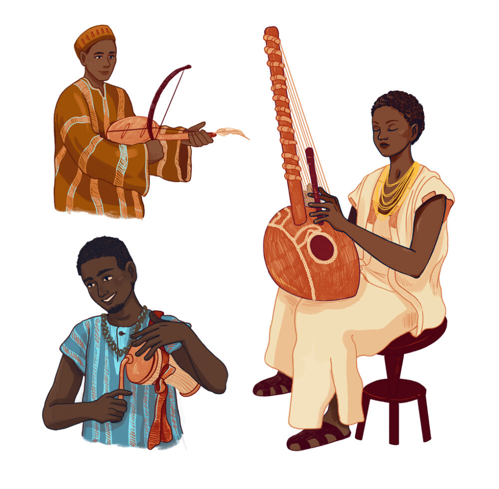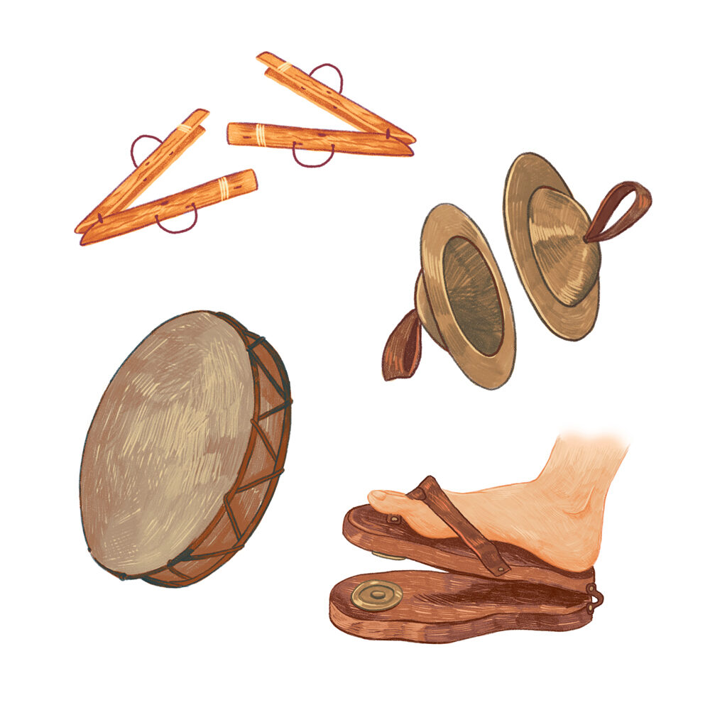 Ikoner som representerar olika musikinstrument genom historien. Dessa illustrationer trycktes av det brasilianska förlaget Intersaberes, för utbildningsmaterial om musik.