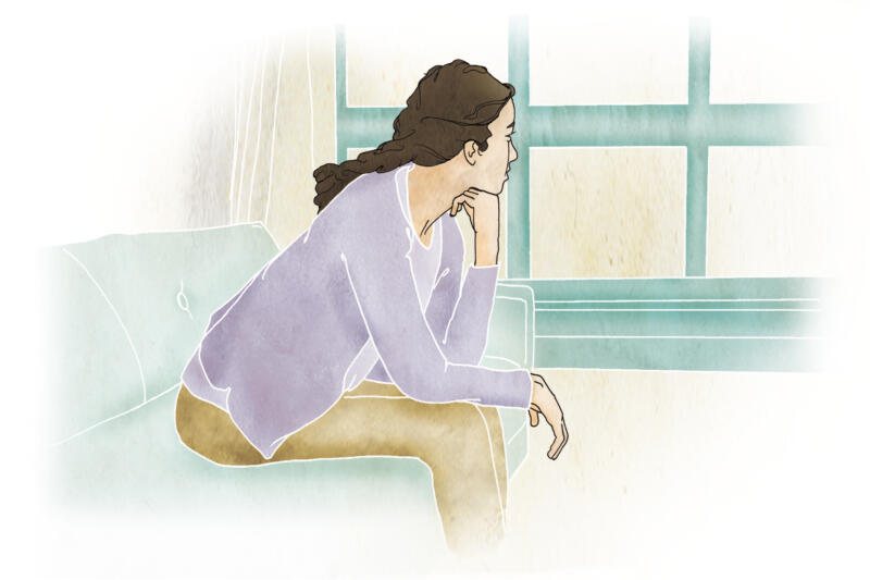 Illustration av en kvinna sittandes i soffa blickar ut genom fönster