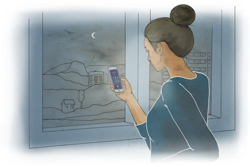 Illustration av en kvinna ståendes vid fönster i natten med mobil
