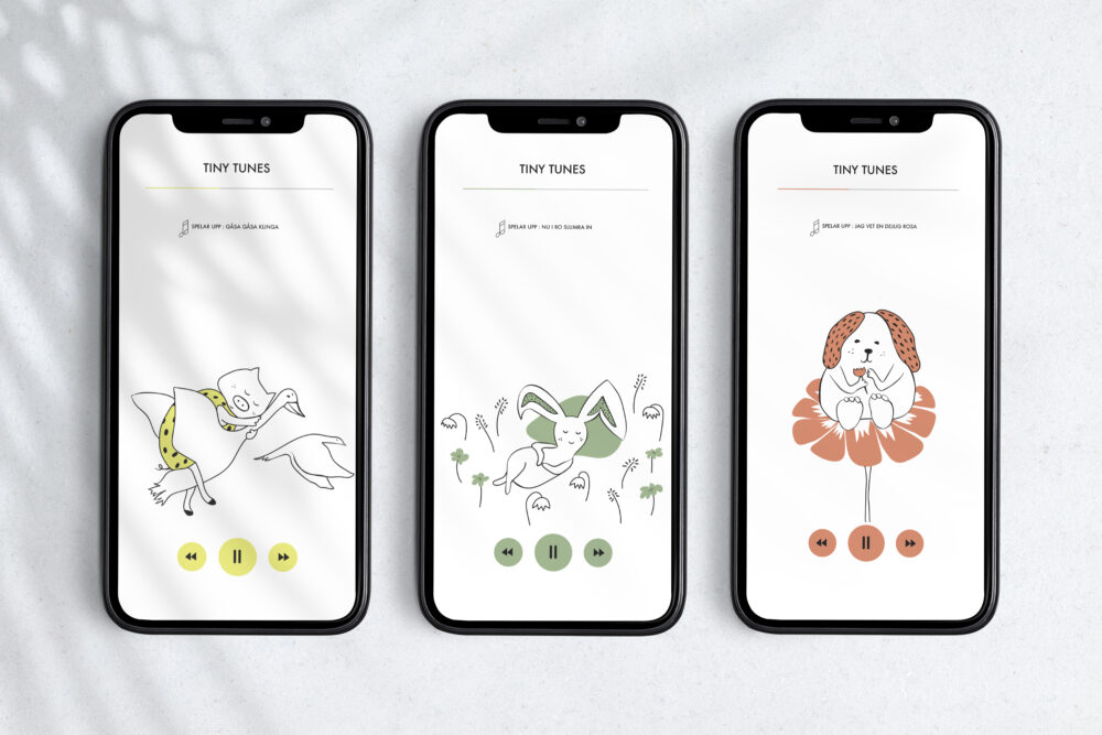 Koncept, form och illustration för barnmusikappen och skivan – Tiny Tottles. Nio små animationer för appen. Skivomslag och produktbilder.
